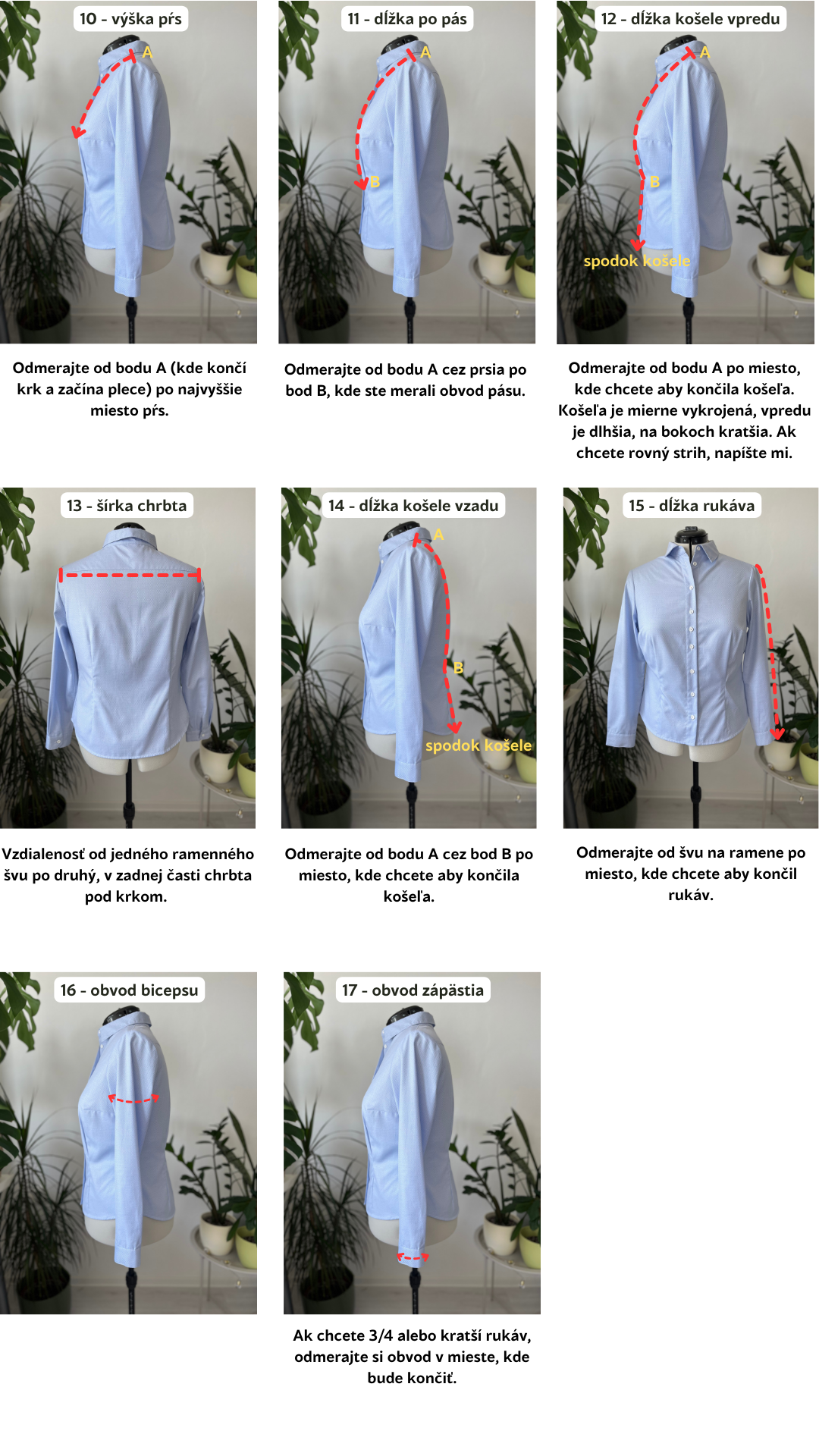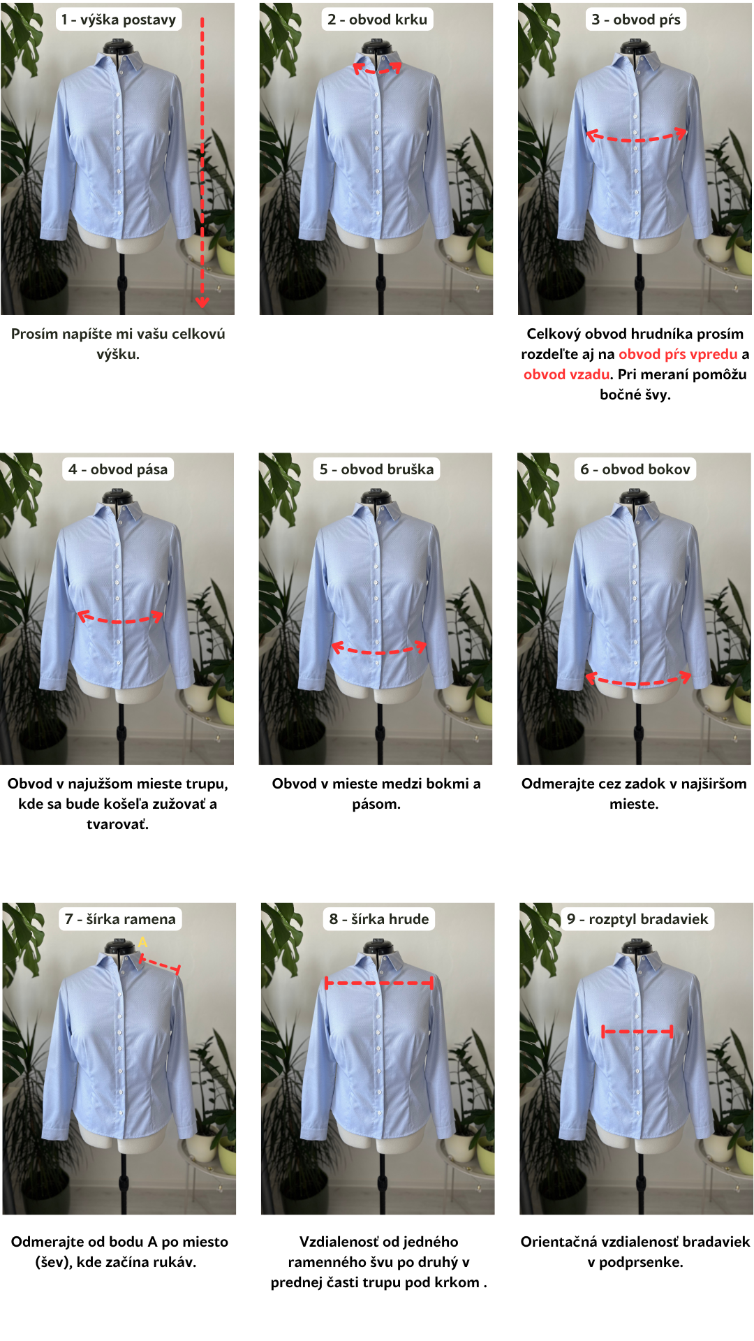 chcem, aby Vám každý kúsok sedel ako uliaty, a preto potrebujem čo najviac Vašich mier. Nemusíte sa báť, meranie je jednoduché. Stačí, ak si zapíšete namerané centimetre za jednotlivé poradové čísla mier a zašlete mi ich. Ak by ste však mali akékoľvek nejasnosti či otázky, prosím napíšte mi a rada Vám poradím.