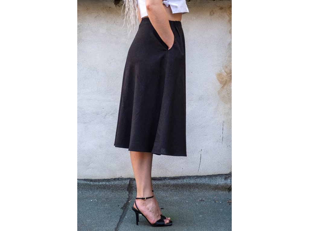 Nadčasová sukňa A-strihu s pohodlným elastickým pásom a vreckami. Postave nepridáva zbytočný objem ale krásne zvýrazňuje ženskú siluetu.